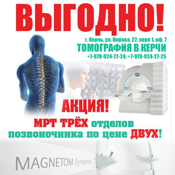 Уважаемые клиенты, в нашем МРТ центре г. Керчи проходит акция: МРТ ТРЕХ отделов позвоночника ПО ЦЕНЕ ДВУХ! Выгода 3000 рублей.
